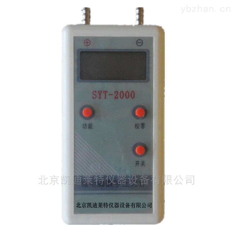 北京凯兴德茂数字压力计$r$nSYT-2000数字压力计是一种便携式微电脑数字压力计,适用于2000Pa压力范围内气体正压、负压,差压的压力测量。仪表具有三种压力状态选择,可适合各种气源条件下使用。配上皮托管仪表可测量管道风压和风速,广泛应用于气体、液体的正压、负压和差压的测量。是各环境监测站、实验室、医药卫生、建筑空调供暖、无尘室测试或标定压力的理想仪器。